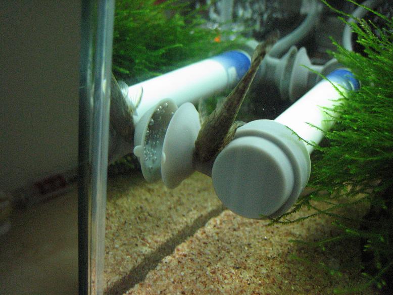 ヒーター周りをモフるネグロと水中を漂うエビの抜け殻ww