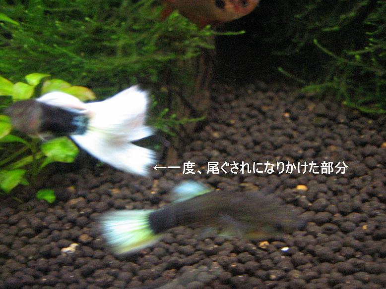 この子が一番初めに発症したオスですね。何らかの原因でひれが切れていますが、矢印の部分が尾ぐされ病になっていました。