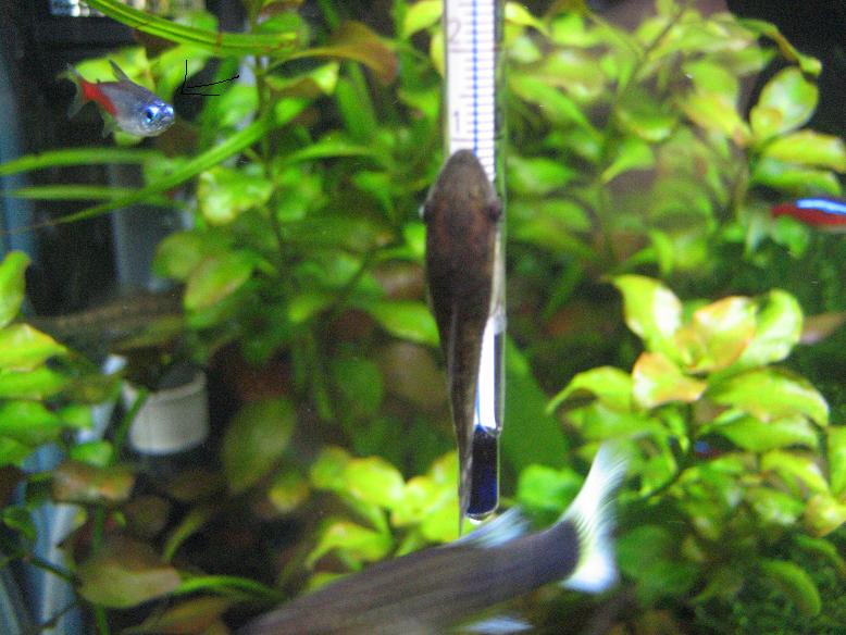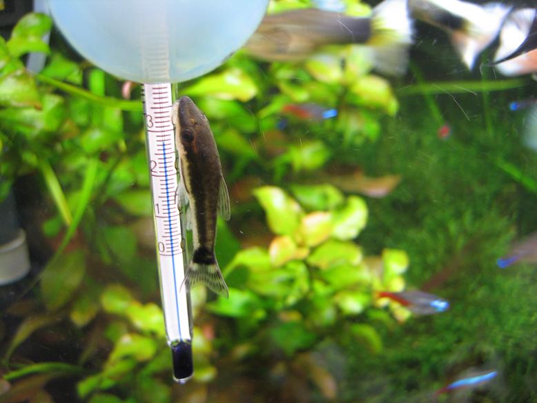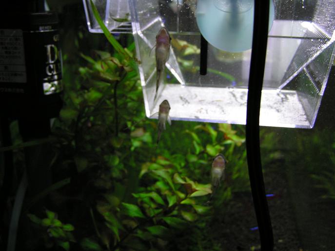 んで、我が家の水槽ですが、深夜、ちょうどhaste-apuaさんのブログのコリドラスの産卵を読んでいるときなんとなく水槽を見てみると・・・