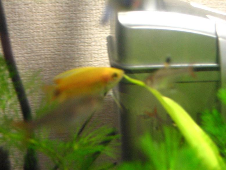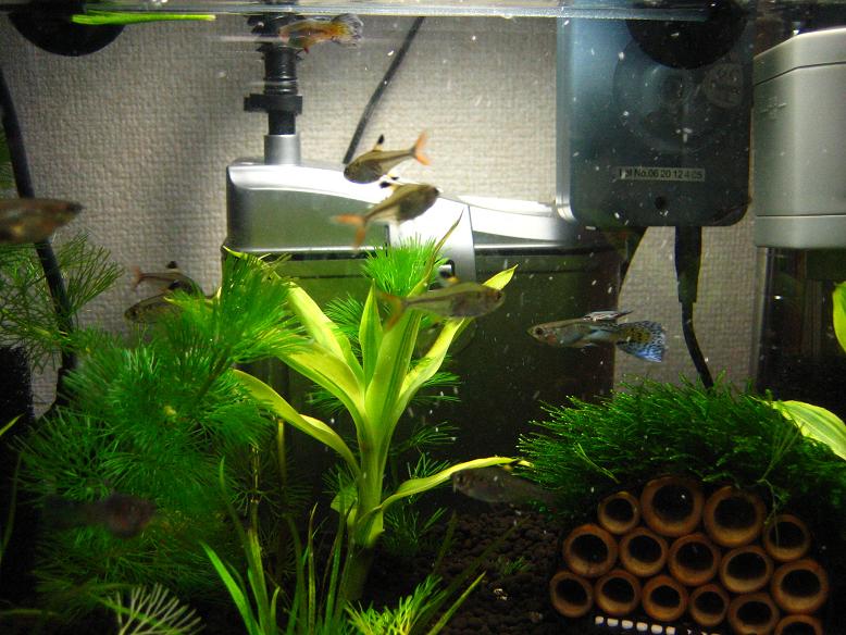 まず、上部フィルターのポンプの上あたりにグッピーが数匹固まっていたり温度計に体を引っ掛けて休んでいたりしますww