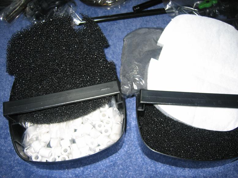 こちらがマットなど。。まあ、荒めのブラックスポンジマット、濾過リング、活性炭、ウールマットという感じです。