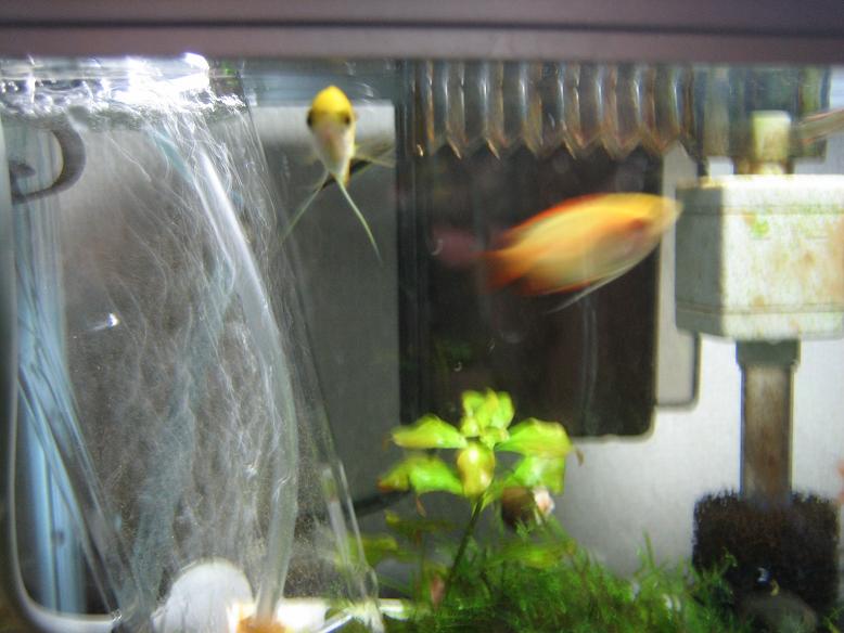 1匹のゴールデンハニーグラミーがカメラ目線、もう1匹は逃げてますww